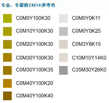 • 专金、专银的CMYK参考色